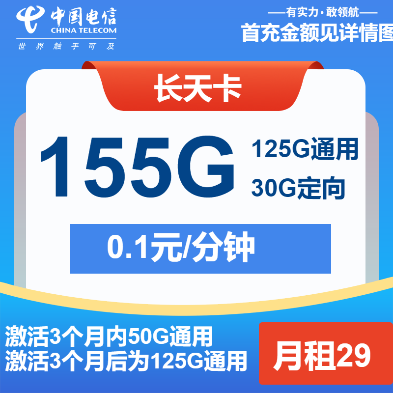 电信长天卡是近期中国电信官方发布的一张29元月租的手机流量卡,每个月29月租包含了125G全国通用流量和30G全国定向流量。两年优惠套餐,号卡套餐支持5G网络。下面就让优卡网带领大家来看看电信长天卡套餐详细介绍和申请方法。
