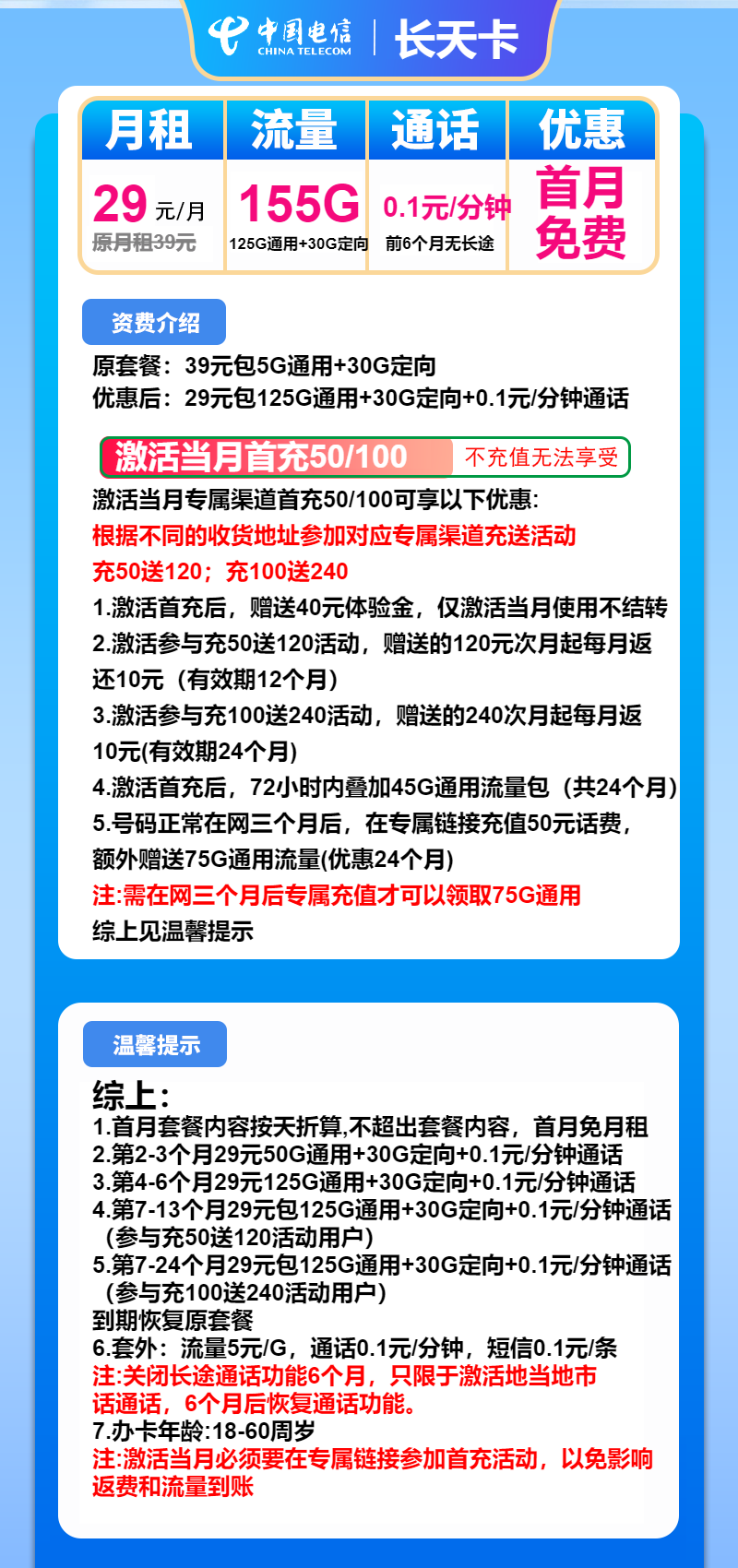 综上:首月套餐内容按天折算,首月免月租。第2-3月起29元包50G通用+30G定向,第4-6月起29元包125G通用+30G定向,第7-24月起29元包125G通用+30G定向,优惠到期恢复为原套餐。可享受两年的流量卡套餐。