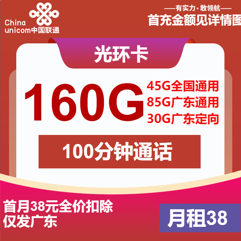 联通光环卡38元月租包130G通用+30G定向+100分钟通话