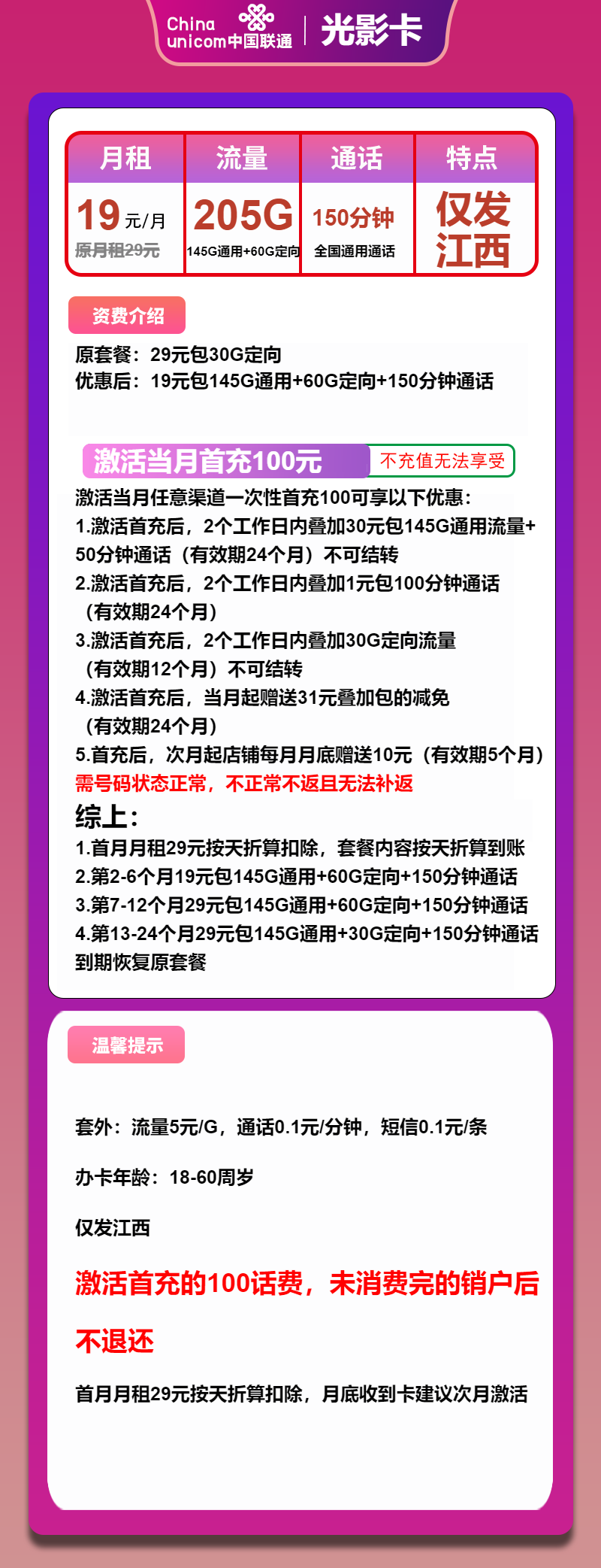 3、激活首充后2个工作日内叠加1元包100分钟通话,优惠期24个月。