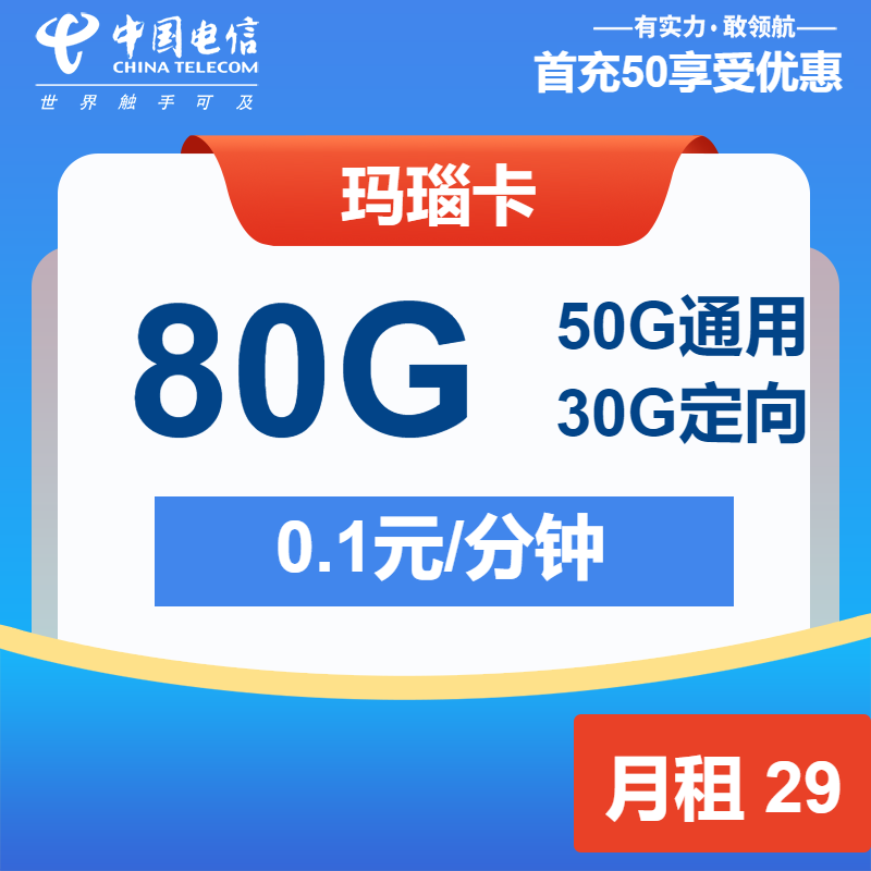 电信玛瑙卡是近期中国电信官方发布的一张29元月租的手机流量卡,每个月29月租包含了50G全国通用流量和30G全国定向流量。长期优惠套餐,号卡套餐支持5G网络。下面就让优卡网带领大家来看看电信玛瑙卡套餐详细介绍和申请方法。