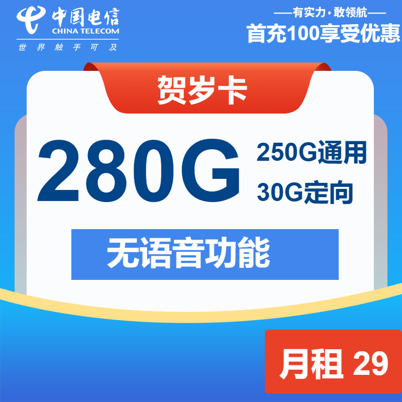 电信贺岁卡是近期中国电信官方发布的一张29元月租的手机流量卡,每个月29月租包含了250G全国通用流量和30G全国定向流量。长期优惠套餐,号卡套餐支持5G网络。下面就让优卡网带领大家来看看电信贺岁卡套餐详细介绍和申请方法。