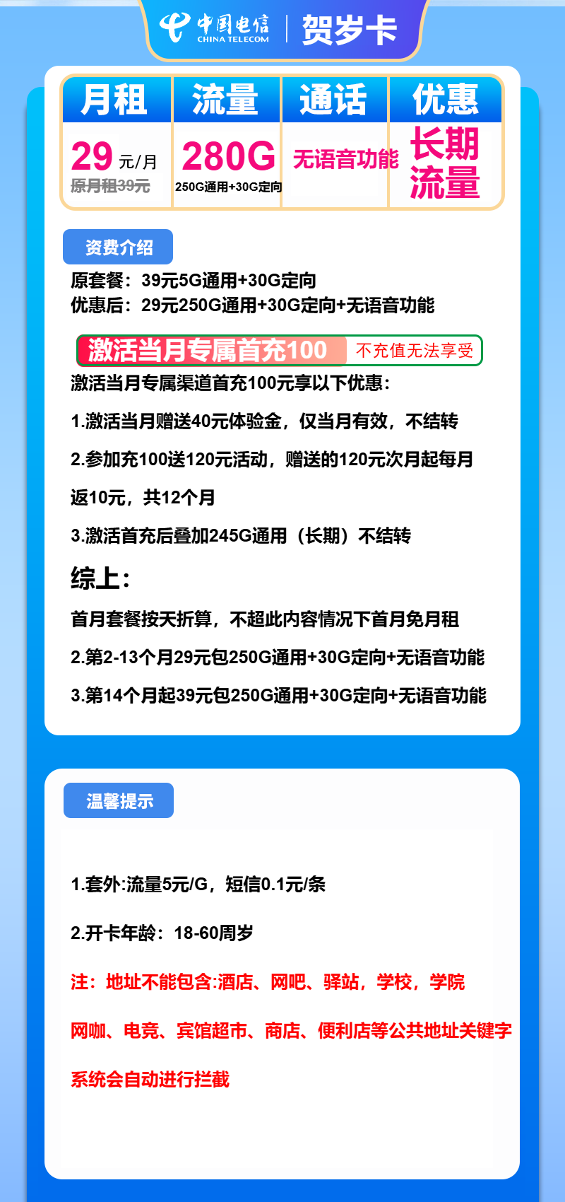 综上:首月套餐内容按天折算,首月免月租。第2-13月起29元包250G通用+30G定向,第14月起39元包250G通用+30G定向。长期可享受的流量卡套餐。