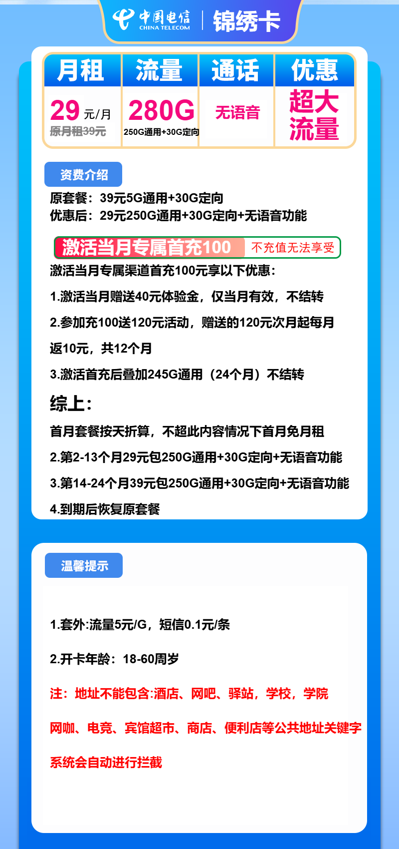 电信锦绣卡是近期中国电信官方发布的一张29元月租的手机流量卡,每个月29月租包含了250G全国通用流量和30G全国定向流量。两年优惠套餐,号卡套餐支持5G网络。下面就让优卡网带领大家来看看电信锦绣卡套餐详细介绍和申请方法。