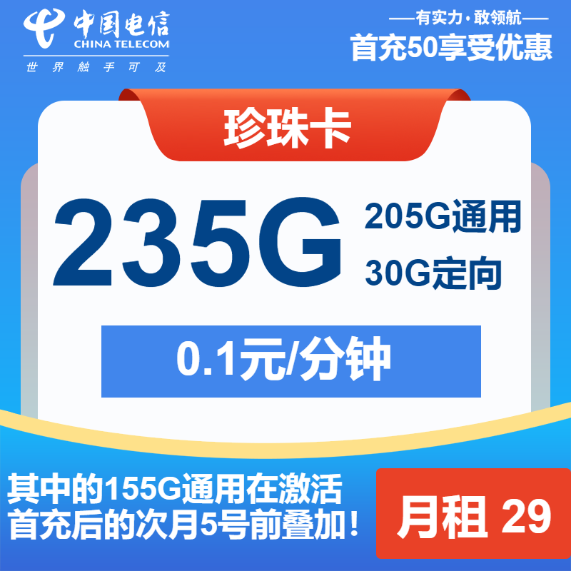 电信珍珠卡是近期中国电信官方发布的一张29元月租的手机流量卡,每个月29月租包含了205G全国通用流量和30G全国定向流量。长期优惠套餐,号卡套餐支持5G网络。下面就让优卡网带领大家来看看电信珍珠卡套餐详细介绍和申请方法。