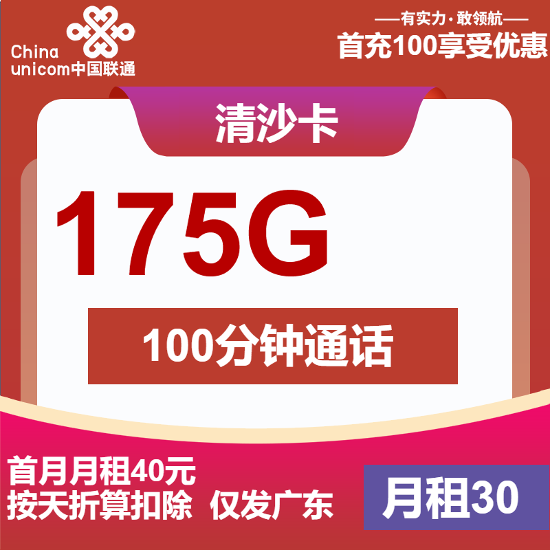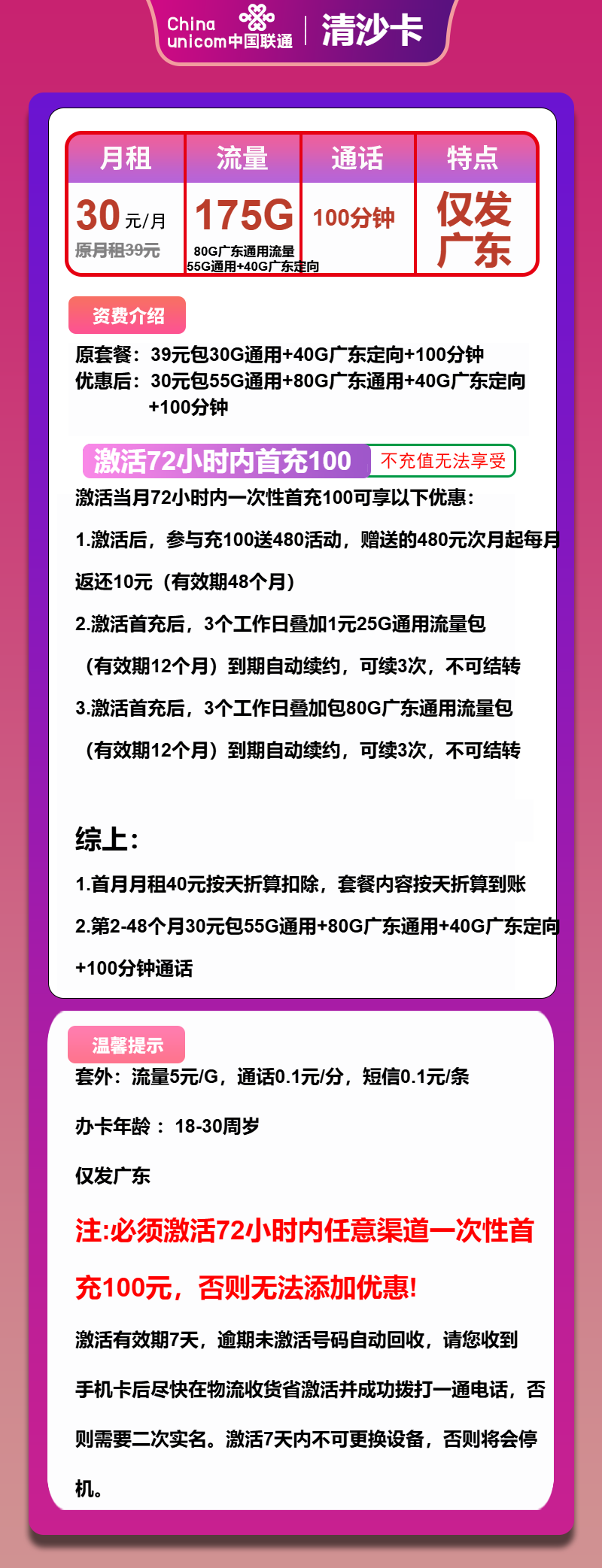 联通清沙卡原套餐是39元/月,包30G通用流量+40广东定向+100分钟通话。