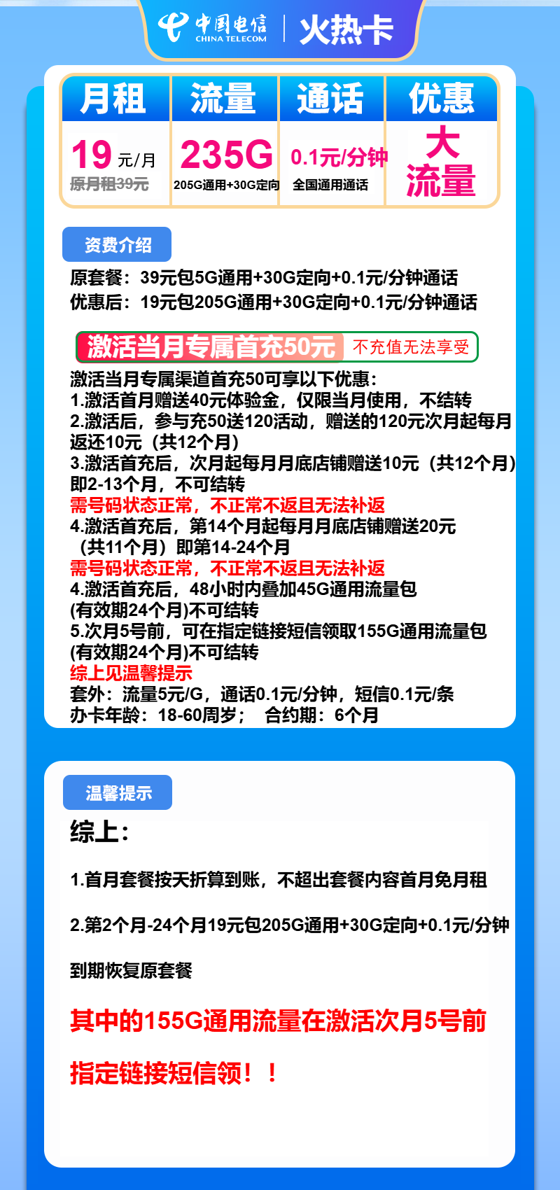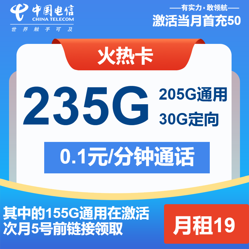 电信火热卡是近期中国电信官方发布的一张19元月租的手机流量卡,每个月19月租包含了205G全国通用流量和30G全国定向流量。两年19月租的优惠套餐,号卡套餐支持5G网络。下面就让优卡网带领大家来看看电信火热卡套餐详细介绍和申请方法。