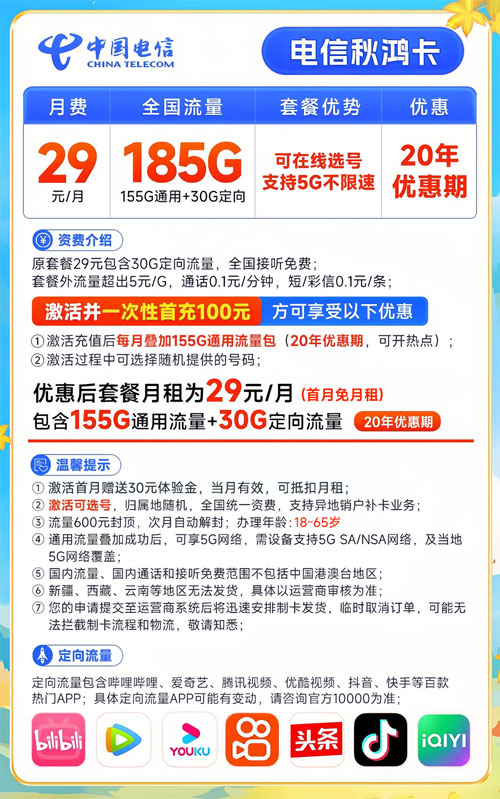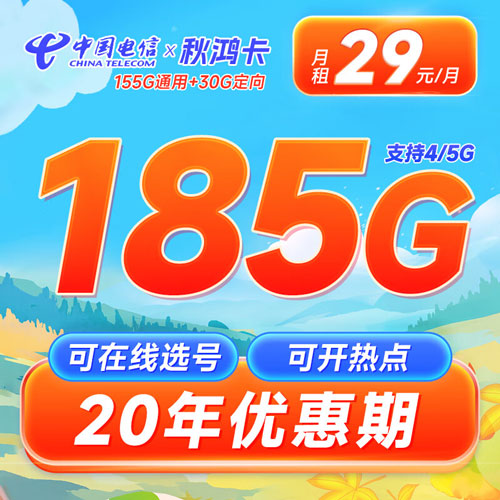 电信秋鸿卡是近期中国电信官方发布的一张29元月租的手机流量卡,每个月包含了155G全国通用流量和30G全国定向流量。号卡套餐支持5G网络。套餐自助激活,激活时可在线选号。下面就让小编带领大家来看看电信秋鸿卡套餐详细介绍和申请方法。