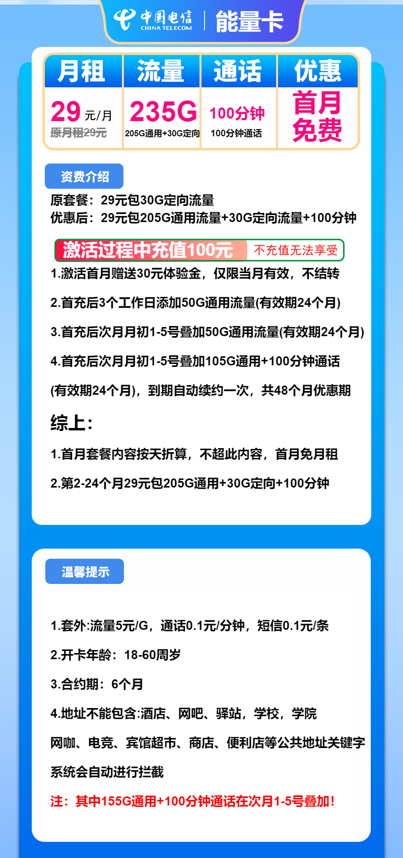 电信能量卡是近期中国电信官方发布的一张29元月租的手机流量卡,每个月29月租包含了205G全国通用流量和30G全国定向流量加100分钟通话。四年优惠套餐,号卡套餐支持5G网络。下面就让优卡网带领大家来看看电信能量卡套餐详细介绍和申请方法。