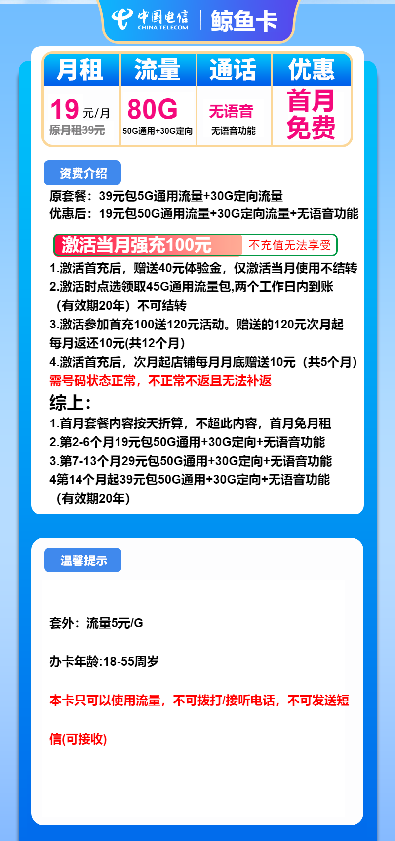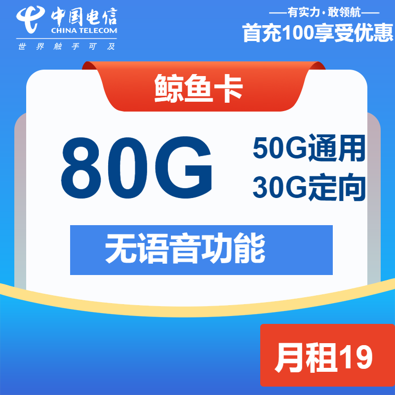 电信鲸鱼卡是近期中国电信官方发布的一张19元月租的手机流量卡,每个月19月租包含了50G全国通用流量和30G全国定向流量。长期优惠套餐,号卡套餐支持5G网络。下面就让优卡网带领大家来看看电信鲸鱼卡套餐详细介绍和申请方法。