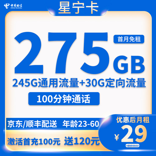 电信星宁卡是近期中国电信官方发布的一张29元月租的手机流量卡,每个月包含了245G全国通用流量和30G全国定向流量,100分钟国内语音通话。号卡套餐支持5G网络。下面就让优卡网带领大家来看看电信星宁卡套餐详细介绍和申请方法。