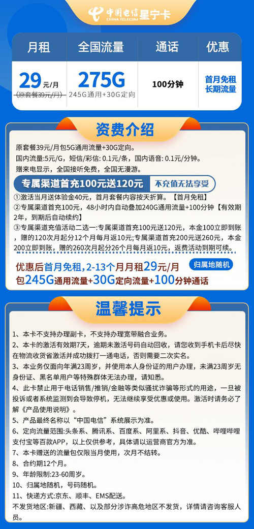 综上:首月免月租,首月套餐内容按天折算。第2月起执行29元包245G通用+30G定向+100分钟通话,到期后继续参加存费送费活动实现长期29。长期可享受的流量卡套餐。