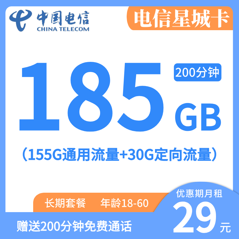 电信星城卡是近期中国电信官方发布的一张29元月租的手机流量卡,每个月包含了155G全国通用流量和30G全国定向流量,200分钟国内语音通话。号卡套餐支持5G网络。下面就让优卡网带领大家来看看电信星城卡套餐详细介绍和申请方法。