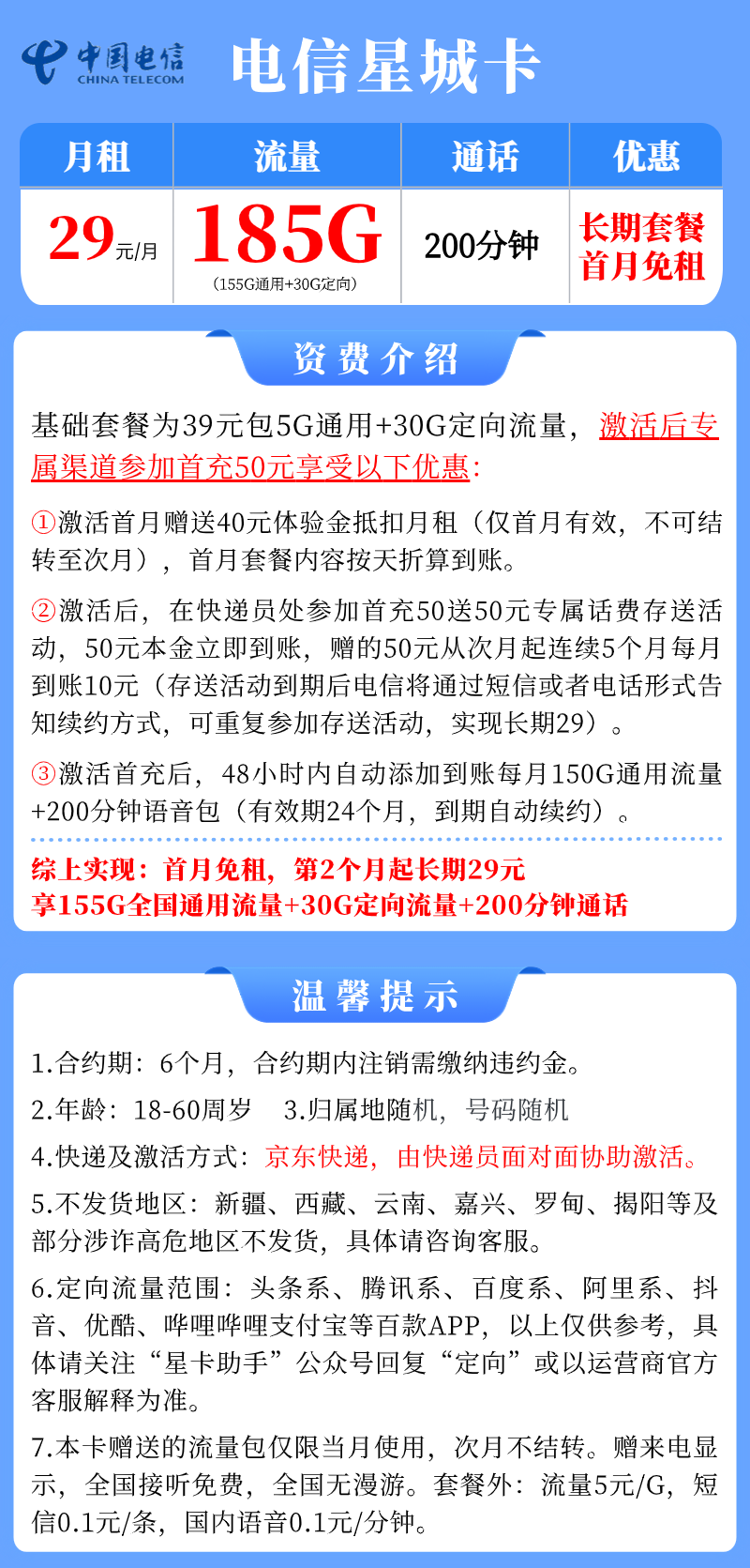 综上:首月套餐内容按天折算,首月免月租。第2-6月月起29元包180G通用+30G定向+200分钟通话,到期后可继续参加存费送费活动实现长期29。长期可享受的流量卡套餐。