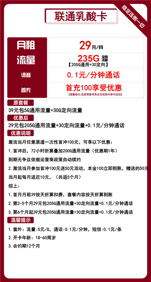 联通乳酸卡是近期中国联通官方发布的一张29元月租的手机流量卡。每个月29元月租包含了205G全国通用流量和30G全国定向流量。号卡套餐支持5G网络,长期套餐流量卡。下面就让优卡网带领大家来看看联通乳酸卡套餐详细介绍和申请方法。
