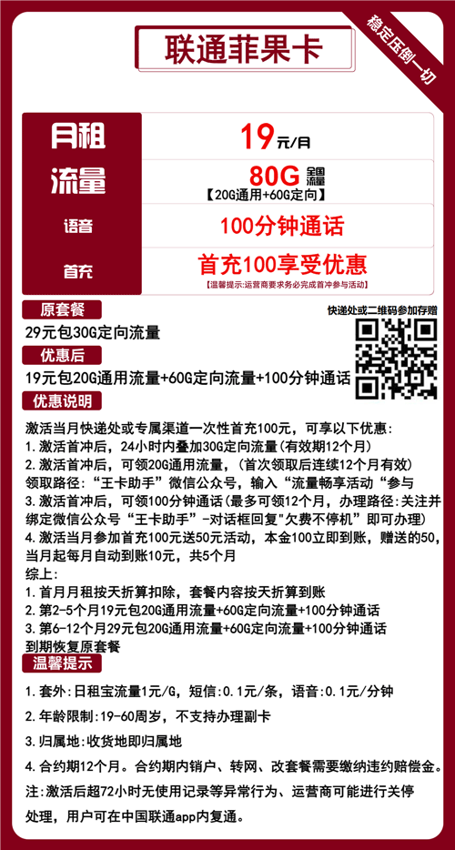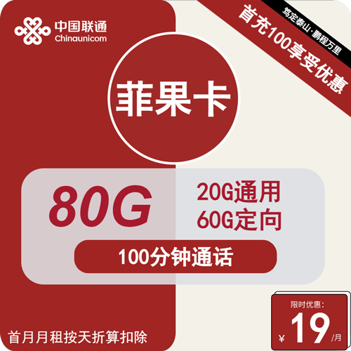 联通菲果卡是近期中国联通官方发布的一张19元月租的手机流量卡。每个月19元月租包含了20G全国通用流量和60G定向流量加100分钟全国通话。号卡套餐支持5G网络,一年优惠期的流量卡套餐。下面就让优卡网带领大家来看看联通菲果卡套餐详细介绍和申请方法。