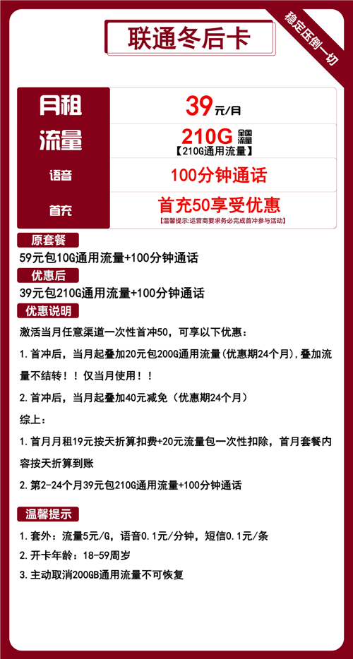 联通冬后卡是近期中国联通官方发布的一张39元月租的手机流量卡。每个月39元月租包含了210G全国通用流量和100分钟全国通话。号卡套餐支持5G网络,两年优惠套餐流量卡。下面就让优卡网带领大家来看看联通冬后卡套餐详细介绍和申请方法。