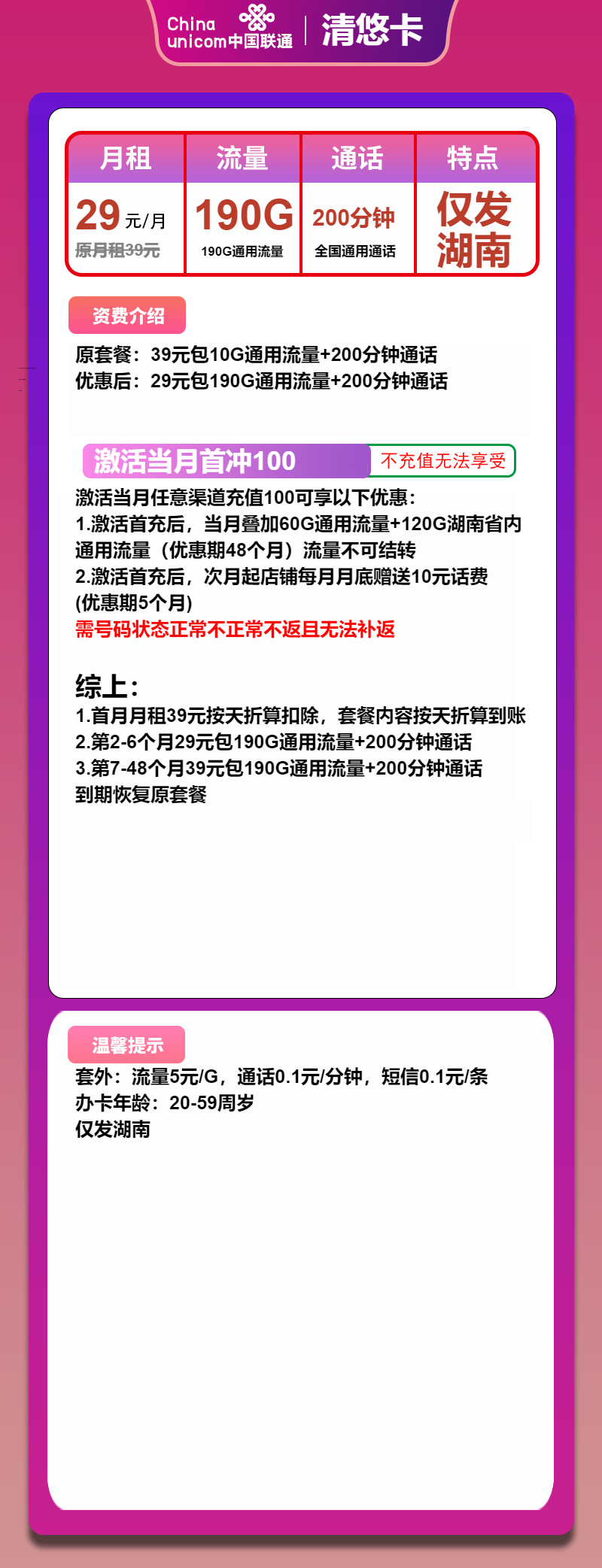 2、激活首充后当月叠加60G通用流量+120G湖南省内通用流量。优惠期48个月。