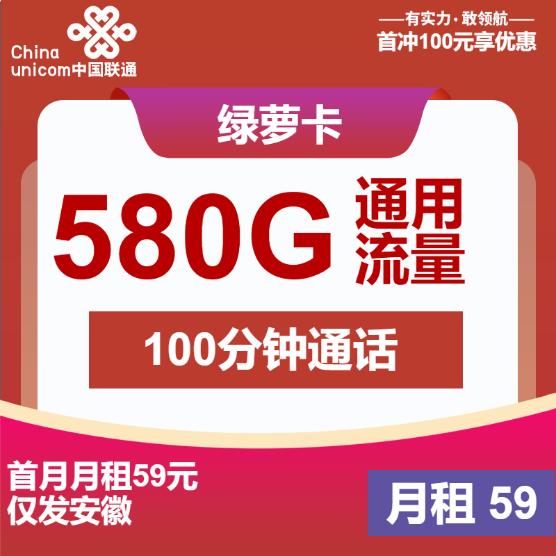 联通绿萝卡59元月租包580G通用+100分钟通话