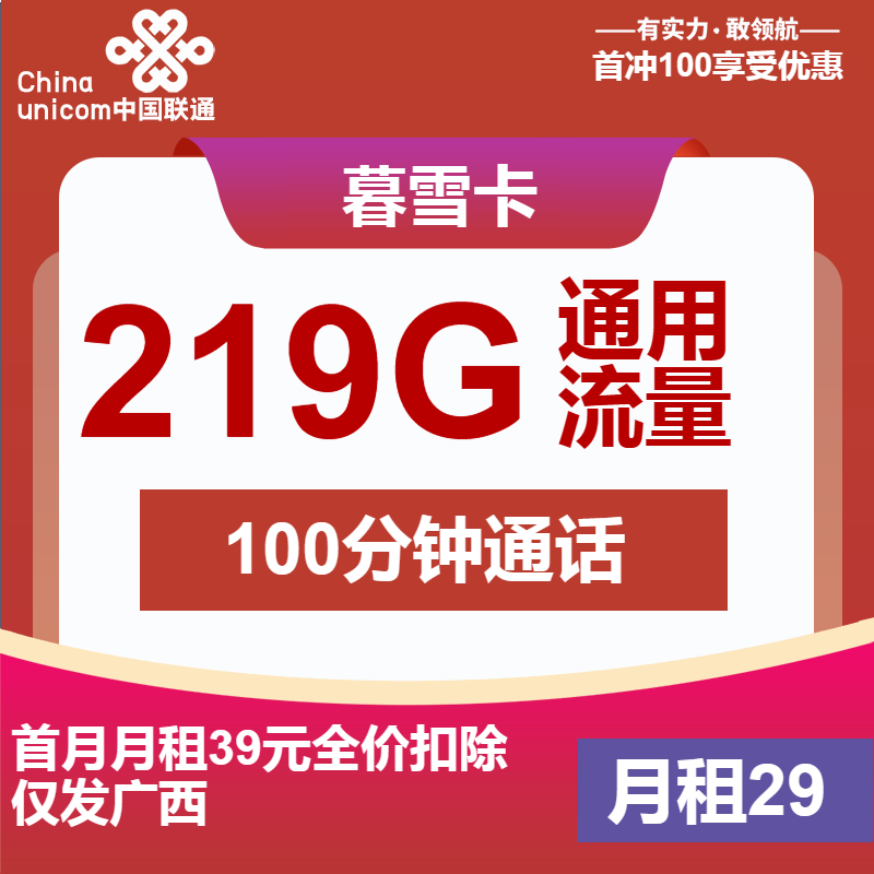 联通暮雪卡29元月租包219G通用+100分钟通话