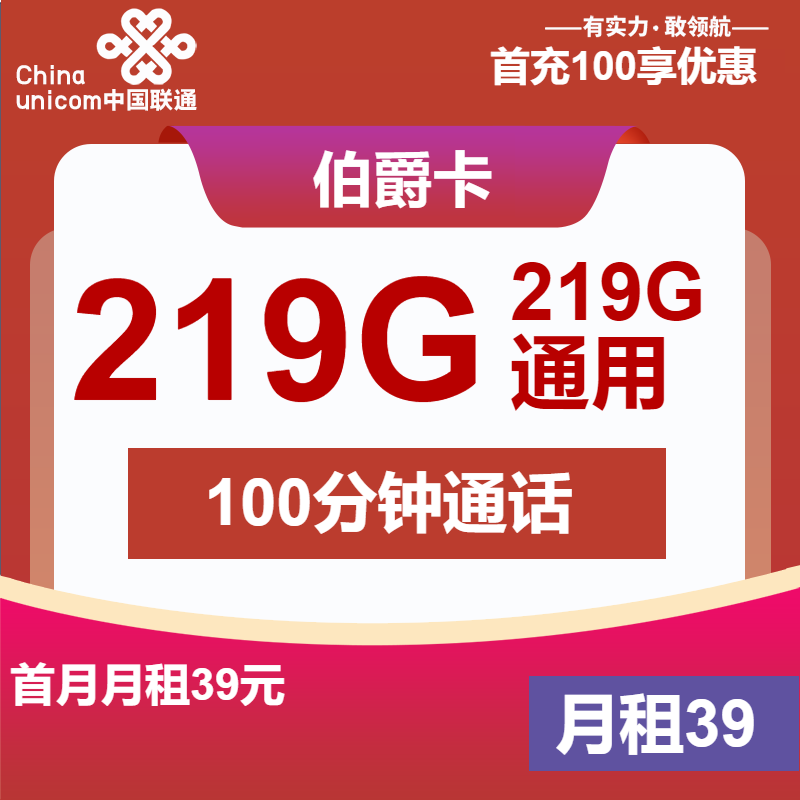 联通伯爵卡39元月租包219G通用+100分钟通话