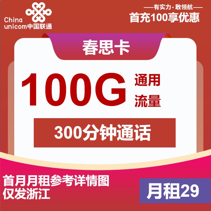 联通春思卡是近期就浙江联通官方发布的一张29元月租的手机流量卡。每个月29元月租包含了100G全国通用流量和300分钟全国通话。号卡套餐支持5G网络,长期优惠套餐流量卡。下面就让优卡网带领大家来看看联通春思卡套餐详细介绍和申请方法。