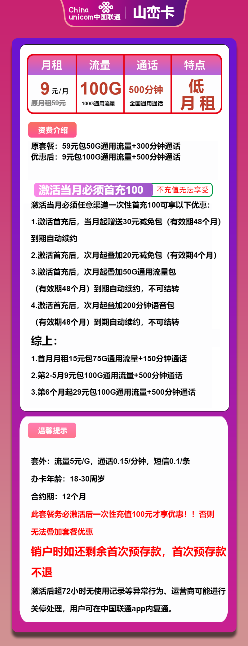 综上:激活首月扣15月租,套餐内容部分到账,第2-5月起9元包100G通用流量+500分钟通话,第6月起29元包100G通用流量+500分钟通话。长期可享受的流量卡套餐。