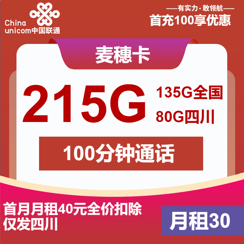 联通麦穗卡30元月租包215G通用+100分钟通话