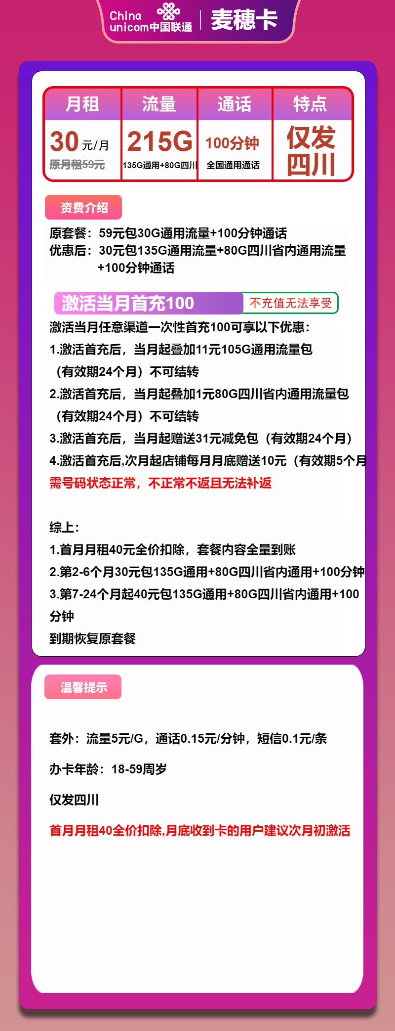 客服帮助:联通麦穗卡30元月租包215G通用+100分钟通话