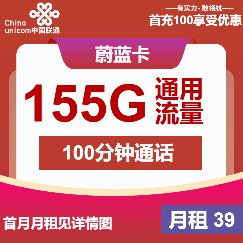 联通蔚蓝卡是近期中国联通官方发布的一张39元月租的手机流量卡。每个月39元月租包含了155G全国通用流量和100分钟全国通话。号卡套餐支持5G网络,长期优惠套餐流量卡。下面就让优卡网带领大家来看看联通蔚蓝卡套餐详细介绍和申请方法。